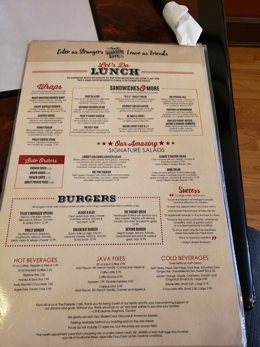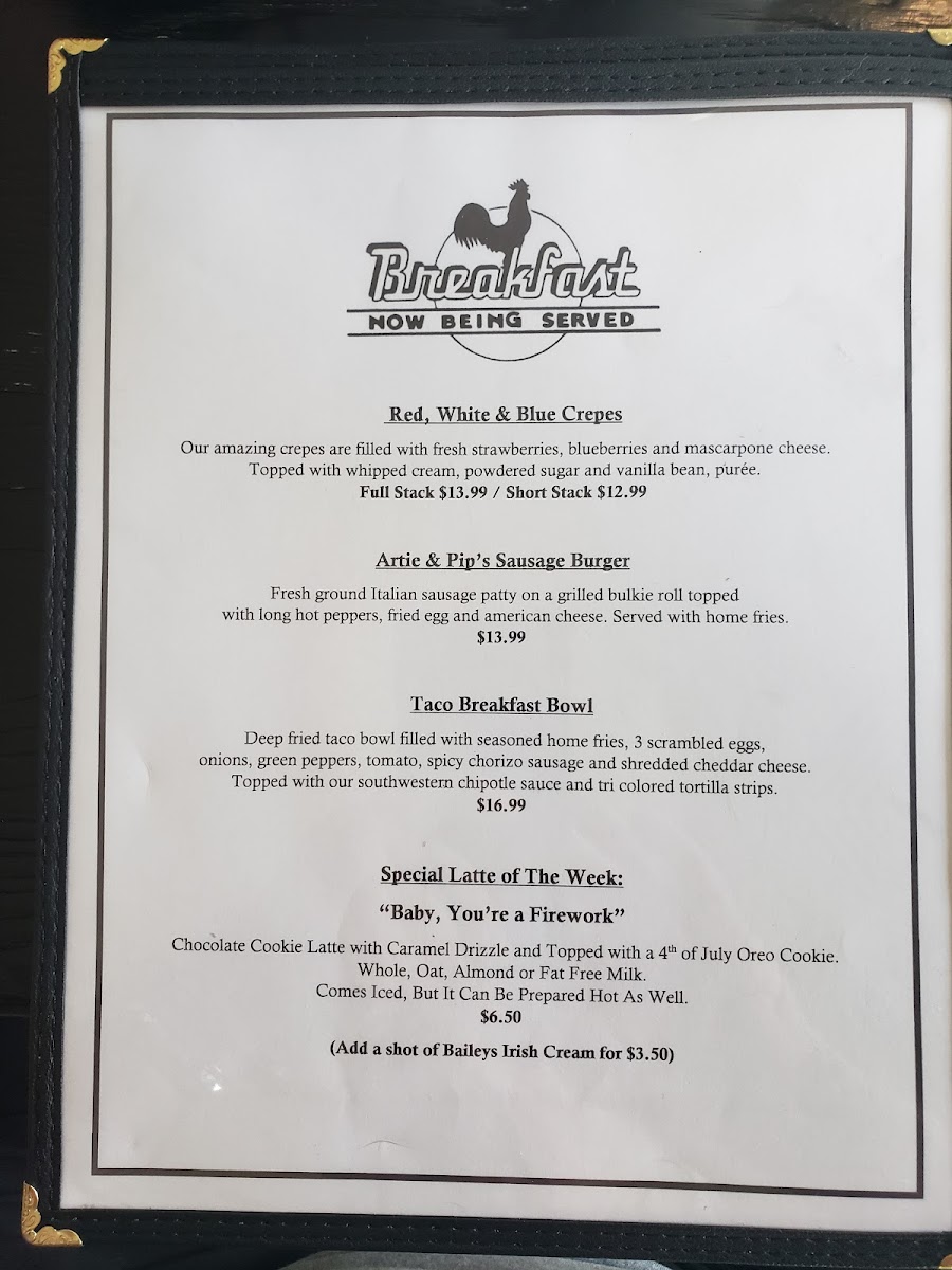 For those looking to enjoy something sweet, the Red, White & Blue Crepes and Artie & Pip's Sausage Burger bring a unique twist to breakfast favorites. Whether you’re in for a cozy breakfast or a fulfilling lunch, Parkside Café offers a menu packed with flavor and comfort at every turn.