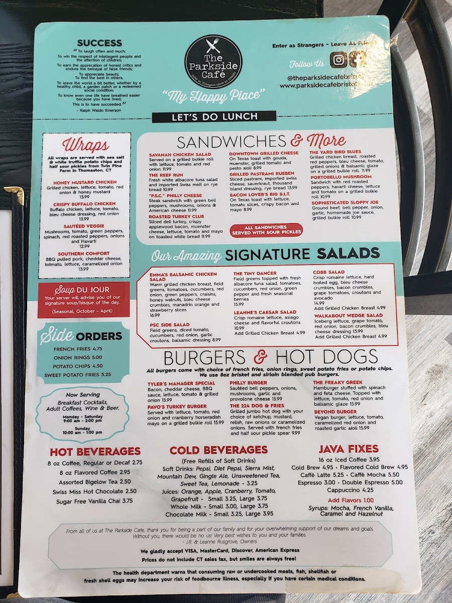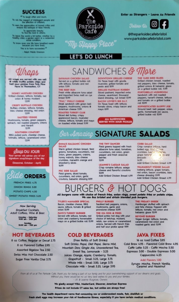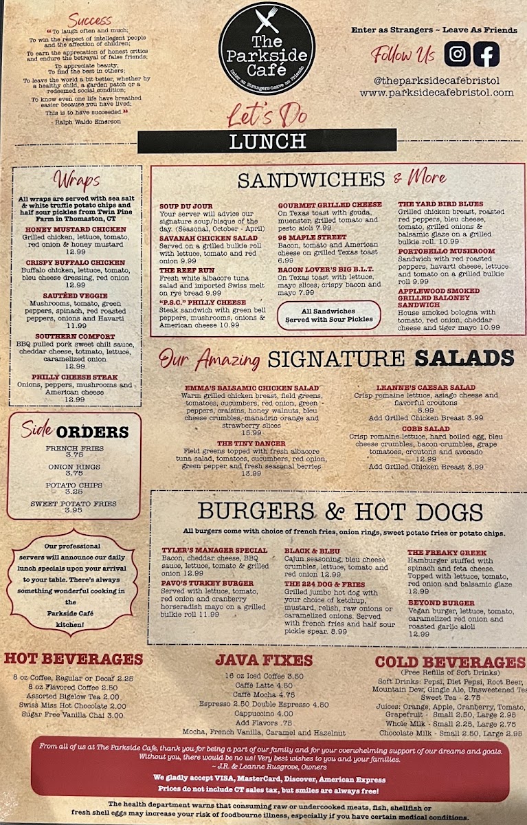 Parkside Café offers a delightful and diverse menu that caters to all tastes, whether you're stopping by for breakfast, lunch, or a comforting hot beverage. Their wraps like the Honey Mustard Chicken and Crispy Buffalo Chicken (prices not listed) are flavorful and satisfying. For those who prefer something lighter, the Sautéed Veggie Southern Comfort wrap presents a hearty yet healthy option. Hot beverages include classic choices like 8 Oz Coffee (regular or decaf) and indulgent options like Swiss Miss Hot Chocolate or Sugar-Free Vanilla Chai, perfect for warming up on a chilly day.