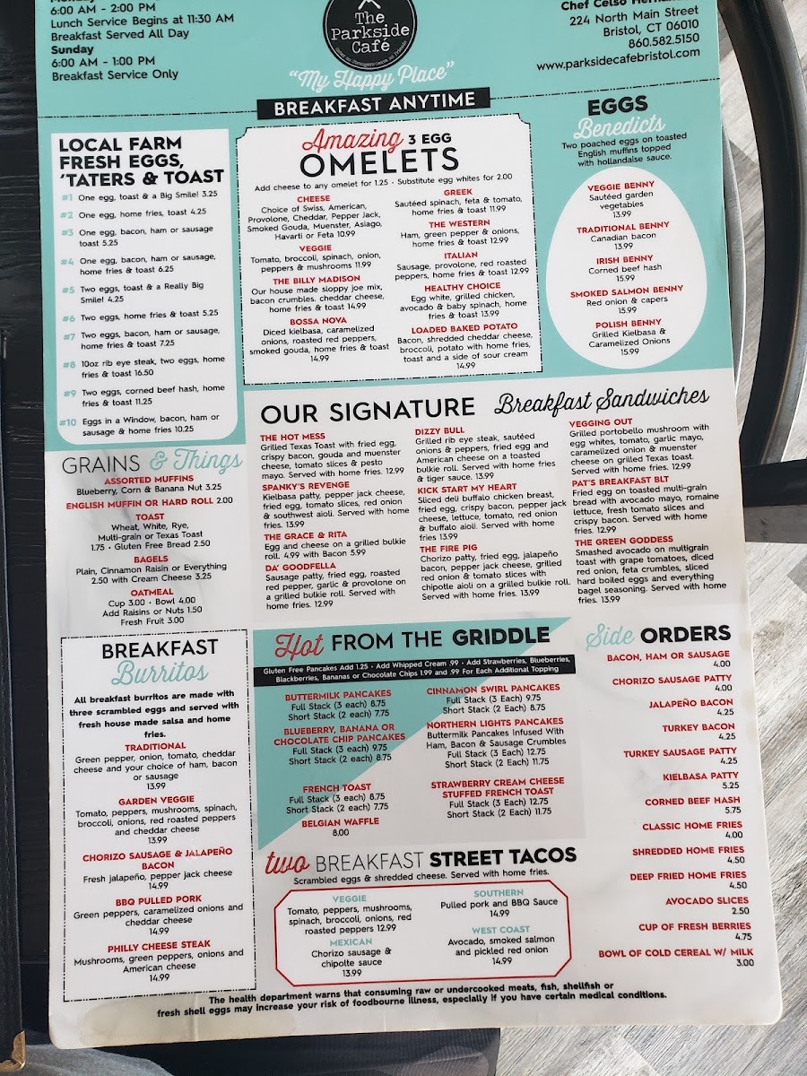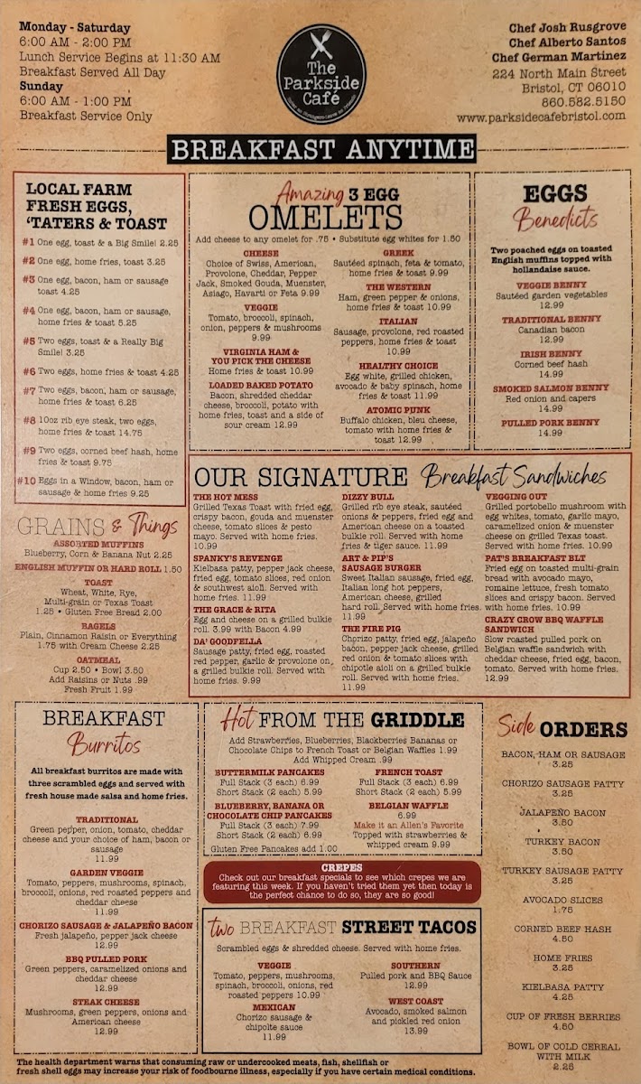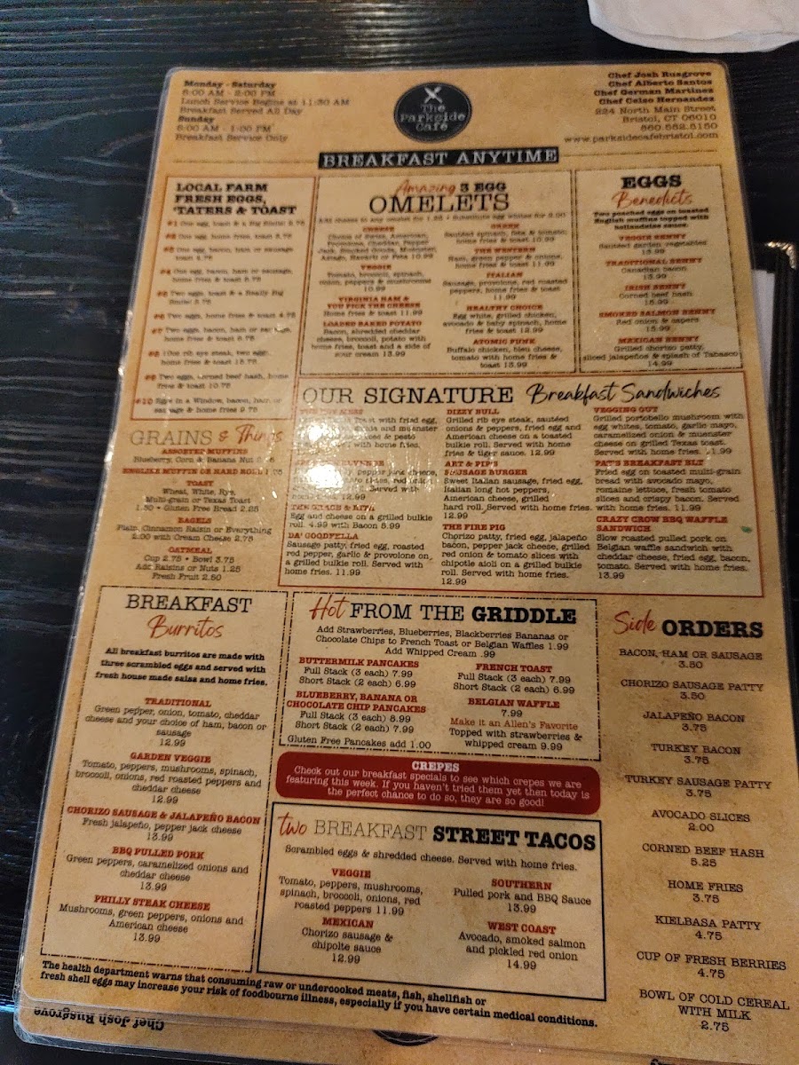 Parkside Café's breakfast menu shines with creative dishes like the Mandarin Orange & Chocolate Chip Crepes and the Cinnamon Swirl Pancakes, while the Uncle Willy's Hash Skillet is a hearty choice for breakfast lovers. Signature breakfast sandwiches like Spanky's Revenge and The Fire Pig promise to fuel your day with bold flavors.